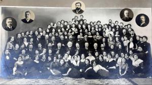 Организовывали такие съемки обычно сами девушки (инициативная группа) – в одном из фотоателье (реже фотограф приезжал прямо на курсы), приглашали профессоров и преподавателей; в тех случаях, когда тот или иной приглашенный не мог приехать, просили разрешение поместить фотографию. На данной фотографии в овалах помещены портреты профессоров, пользовавшихся безусловным авторитетом на курсах: историка античности М.И. Ростовцева, историка русской литературы Д.Н. Овсянико-Куликовского, профессора русской истории С.Ф. Платонова и филолога-классика Ф.Ф. Зелинского; в центре – портрет первого выборного директора ВЖК профессора биологии В.А. Фаусека (1861–1910) – Фаусек пользовался всеобщей любовью на курсах, и его портрет – дань памяти директору, при котором девушки поступили на курсы.