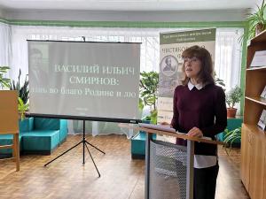 Главный библиотекарь по краеведческой работе Ольга Геннадьевна Рожкова выступила с докладом о нашем земляке "Василий Ильич Смирнов: жизнь во благо Родине и людям".