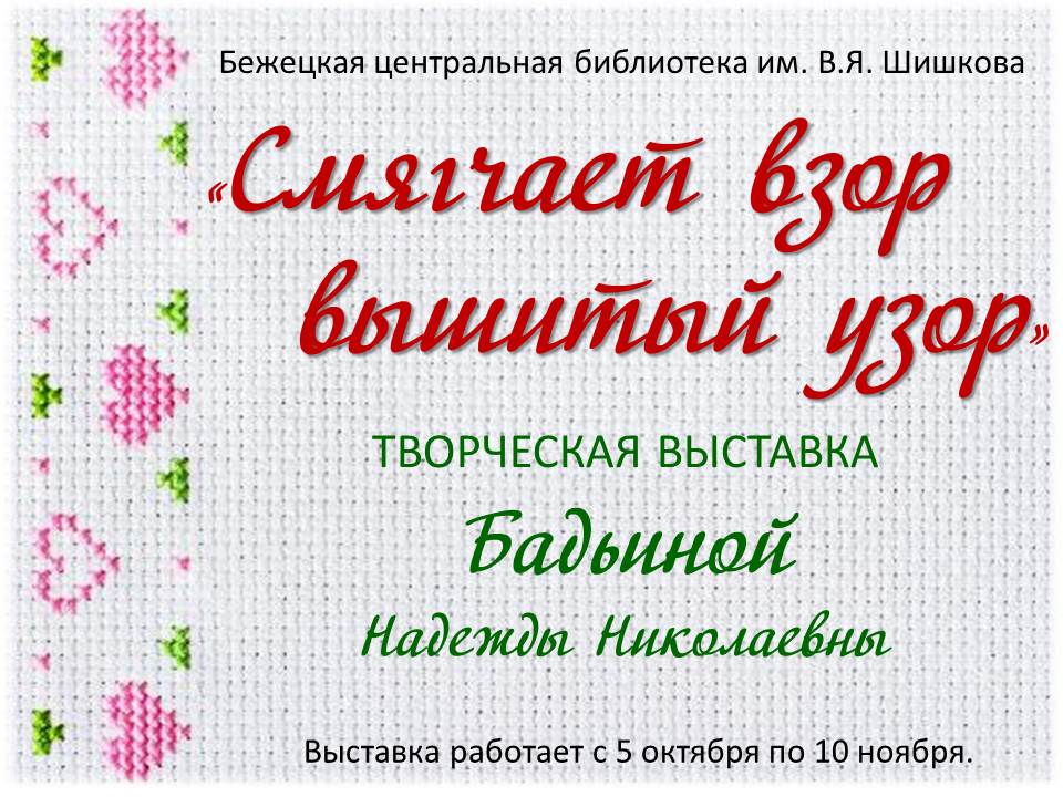 И в дни золотой осени, к юбилею мастерицы, библиотека организовала её творческую выставку «Смягчает взор вышитый узор».