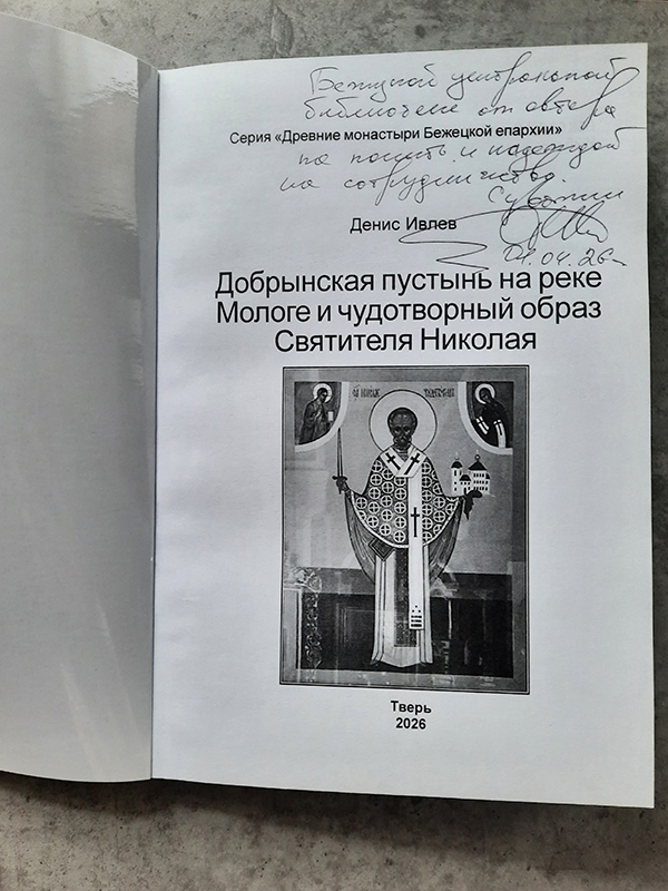 Краеведческий книжный фонд нашей библиотеки пополнился новым изданием Дениса ИВЛЕВА «Добрынская пустынь на реке Мологе и чудотворный образ Святителя Николая».