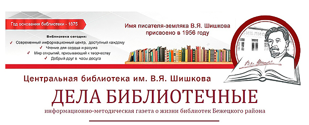 Предлагаем вашему вниманию информационно-методическую газету «Дела библиотечные». Она задумана нами не только как средство продвижения деятельности библиотек Бежецкого района в сообществе, но и как источник общения. На страницах газеты мы удем делиться опытом работы как наших библиотек, так и библиотек Тверской области и России в целом.