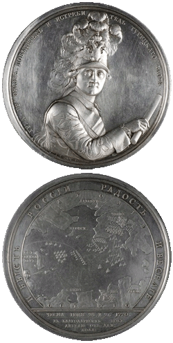1770 г. Медаль изготовлена по указу императрицы Екатерины II для награждения командующего русскими сухопутными и морскими войсками в Средиземном море во время войны с Турцией в 1768-1774 гг. Алексея Орлова. Таким образом были отмечены его заслуги в победе в морском сражении у острова Хиос и за уничтожение турецкого флота при Чесме в июне 1770 г.