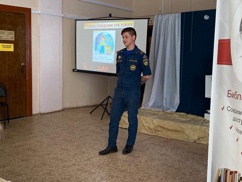 Перед ребятами выступил Виталий Юрченко, инспектор отдела надзорной деятельности и профилактической работы по Бежецкому, Сонковскому, Лесному, Максатихинскому, Рамешковскому районам УНДПР ГУ МЧС России по Тверской области.