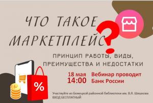 Приходите 18 мая (четверг) в Бежецкую центральную районную библиотеку им. В.Я. Шишкова на лекцию Банка России по теме "Маркетплейс". Лекция организована в рамках совместного проекта Тверской областной универсальной научной библиотеки им. М. Горького и регионального отделения Банка России.