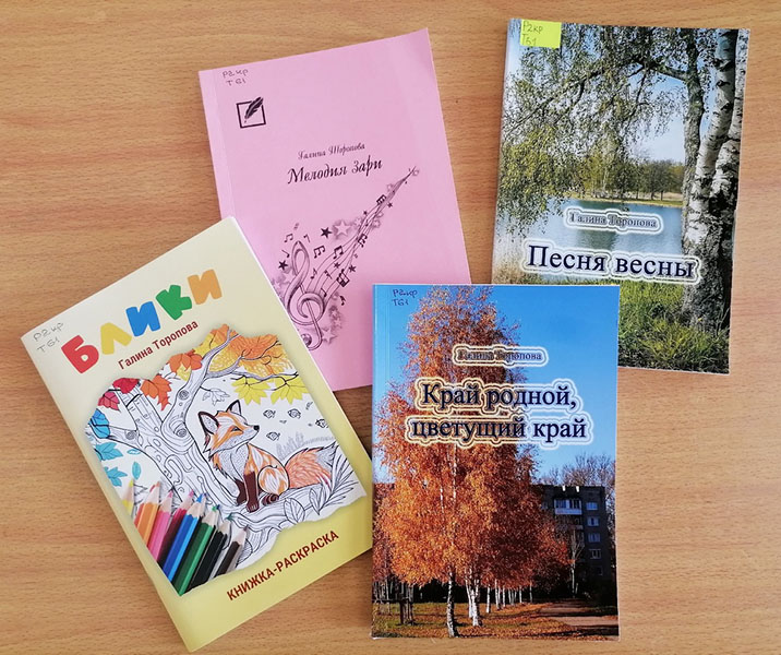 6. Торопова Г. В. Мелодия Зари : стихотворения / Галина Торопова. - Тверь : [б. и.], 2021. - 81, [1] с.. - (Тверской край. события. Люди. Судьбы. краеведческий альманах. ред. В. В. Козырев. вып. 58). - (Поэтический Бежецк. вып. 3)