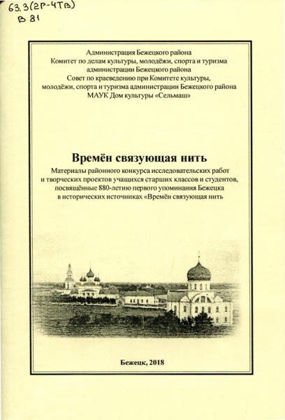 Вып. 2 : Выпуск статей Бежецкого Научного общества по изучению местного края. - 2012. - 110, [2] с. : ил., портр. Авторы– члены Бежецкого научного общества по изучению истории и культуры местного края, созданного в 1920 году, А.А.Спицын, И.Н. Постников, С.Г. Петровский, С.Д. Синицын, Д.А. Золотарев. Первое издание вышло в свет в 1921 году.