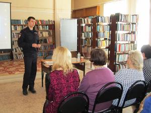 Старший участковый уполномоченный полиции отдела УУП и ПДН МО МВД России "Бежецкий" старший лейтенант Масленников Дмитрий Михайлович рассказал присутствующим, как вести себя в тех случаях, когда мошенники предлагают купить газоанализаторы и фильтры для воды.