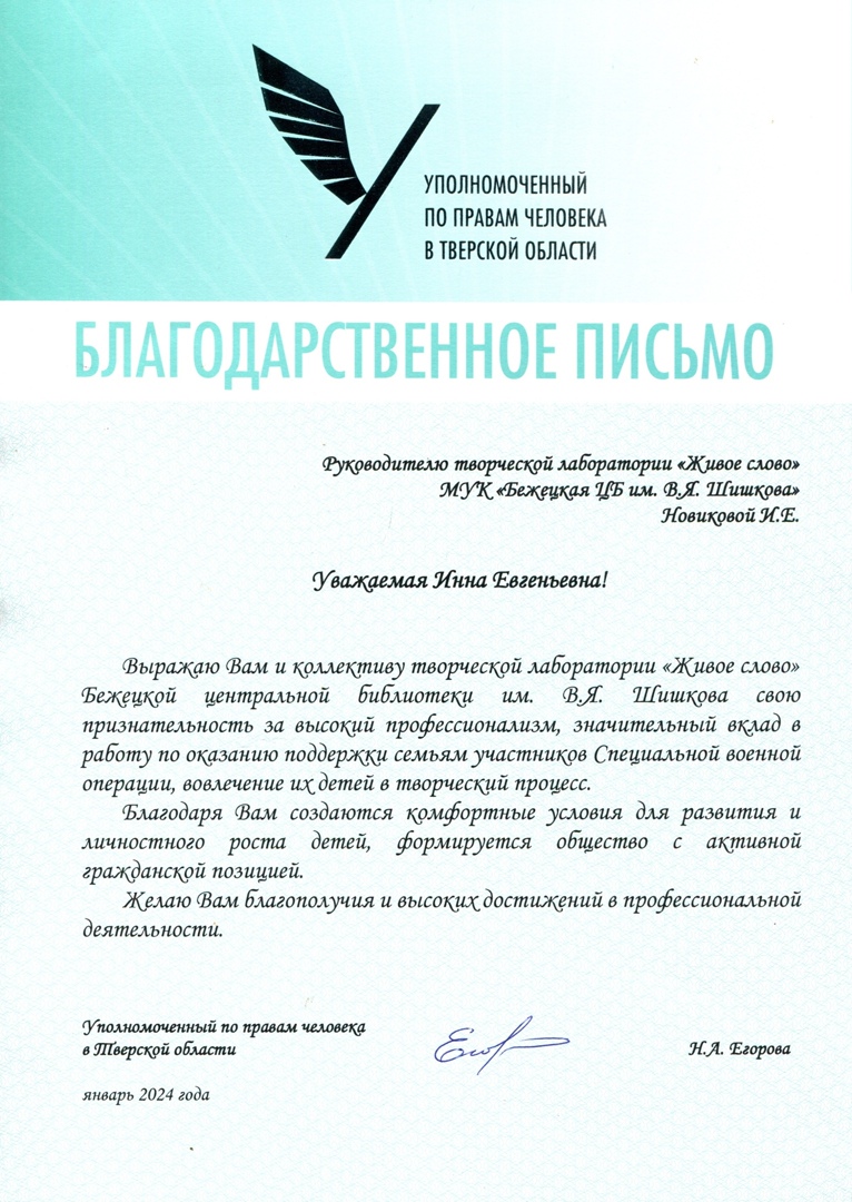 Сегодняшнее утро для коллектива нашей библиотеки началось с приятного момента: В.В. Прокофьев, Общественный помощник Уполномоченного по правам человека в Тверской области, вручил директору библиотеки И.Е. Новиковой Благодарственное письмо от Н.А. Егоровой, Уполномоченного по правам человека в Тверской области, за высокий профессионализм, значительный вклад в работу по оказанию поддержки семьям участников Специальной военной операции, вовлечению их детей в творческий процесс.