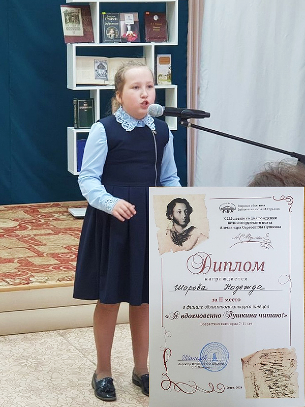 Бежецкий округ представляли победители муниципального этапа: Шарова Надежда (отрывок из поэмы «Руслан и Людмила»), Фёдорова Варвара («Зимнее утро»), Александров Матвей (монолог Барона из пьесы «Скупой рыцарь»).