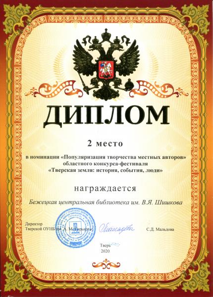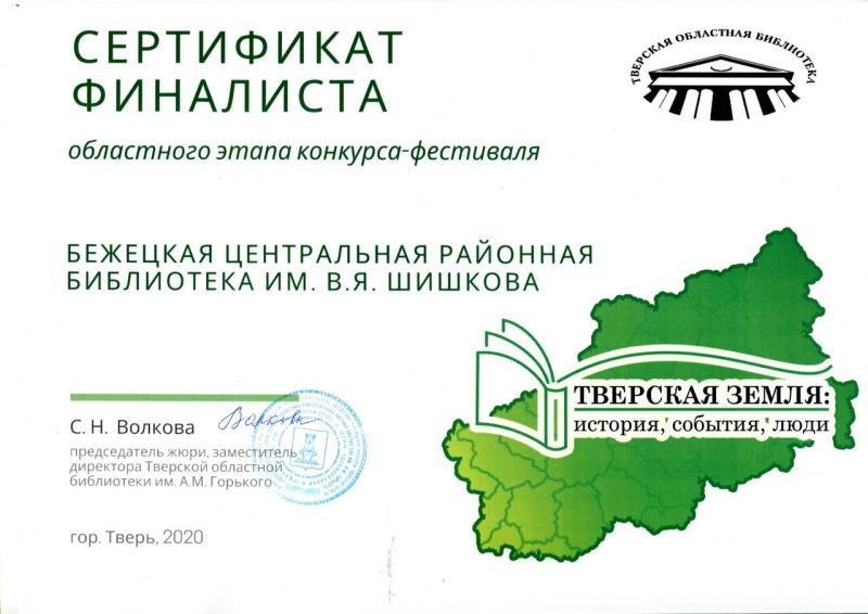 1 место в номинации «Популяризация творчества молодых» - Бежецкая центральная библиотека им. В. Я. Шишкова.Поздравляем все библиотеки, вышедшие в финал, и библиотеки-победители! https://cbs.tverlib.ru/акции-проекты/фестиваль-тверская-земля-история-события-люди/2020-год
