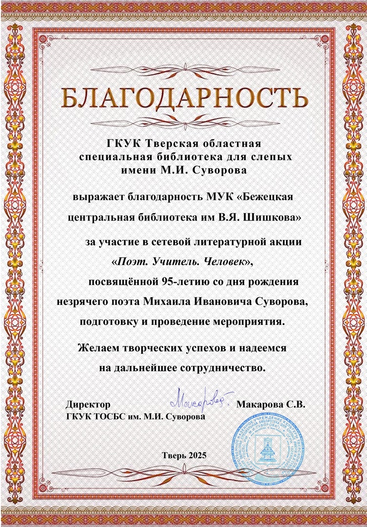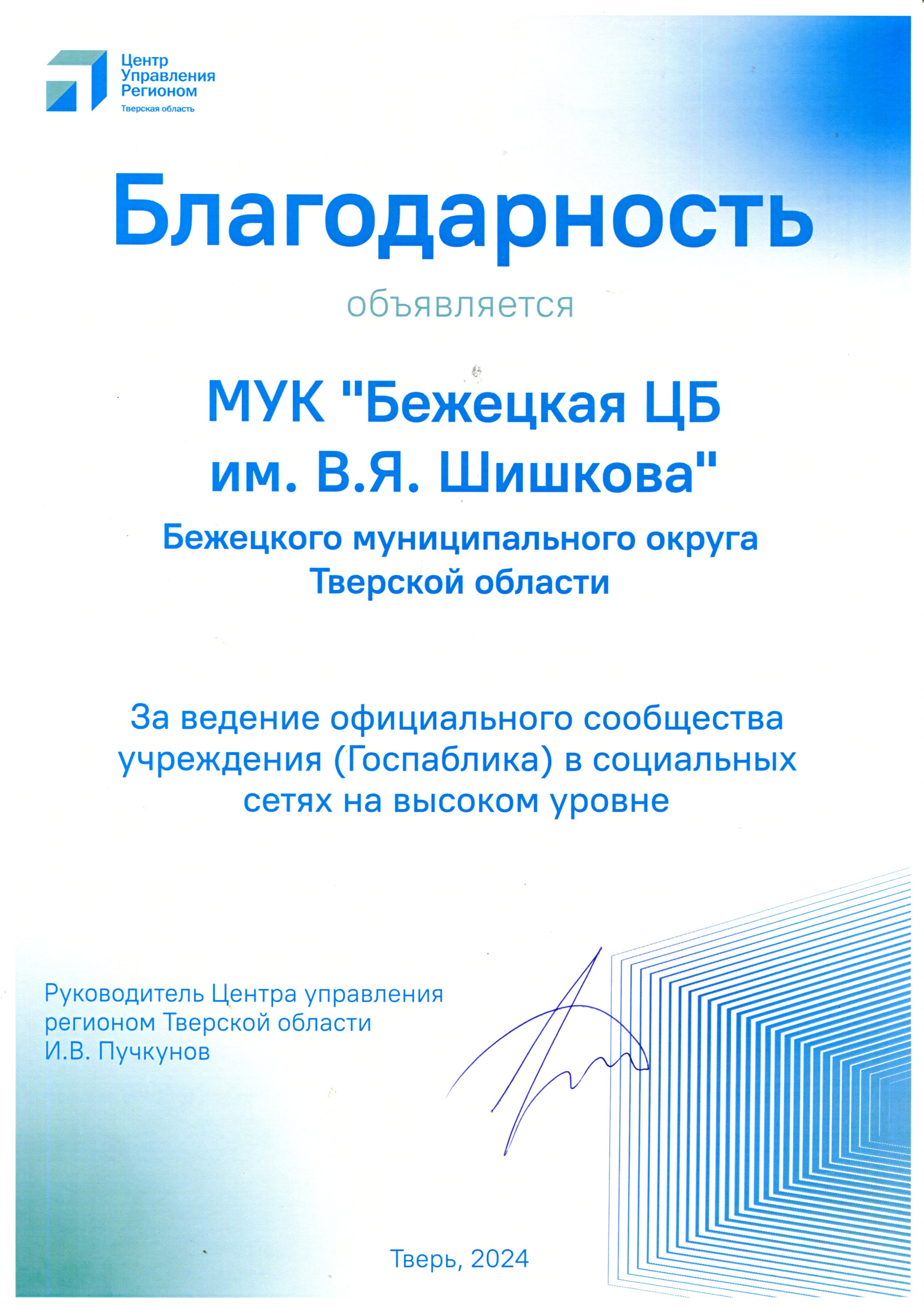 В конце 2024 года на областном итоговом мероприятии библиотека получила Благодарность Центра управления регионом Тверской области.