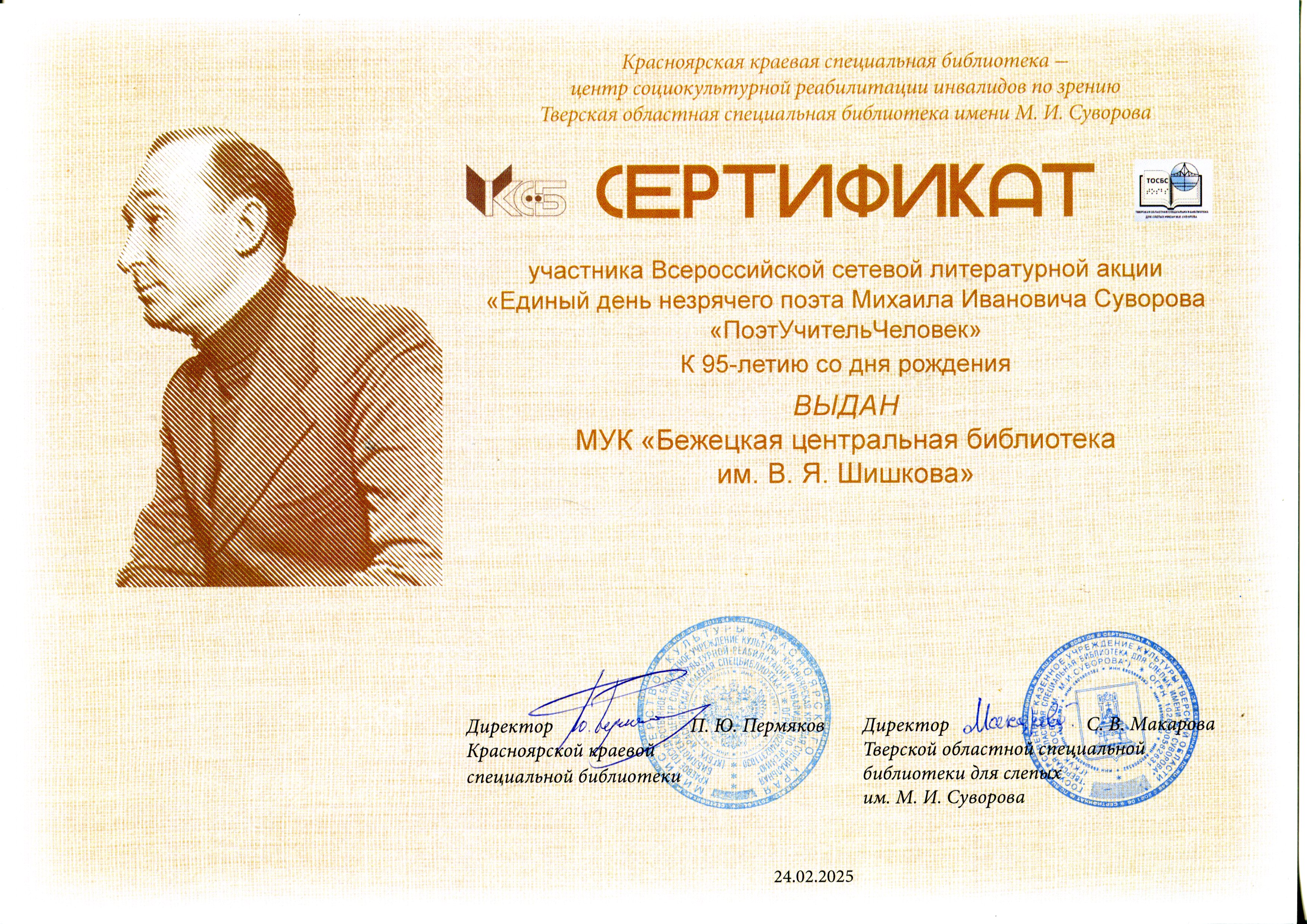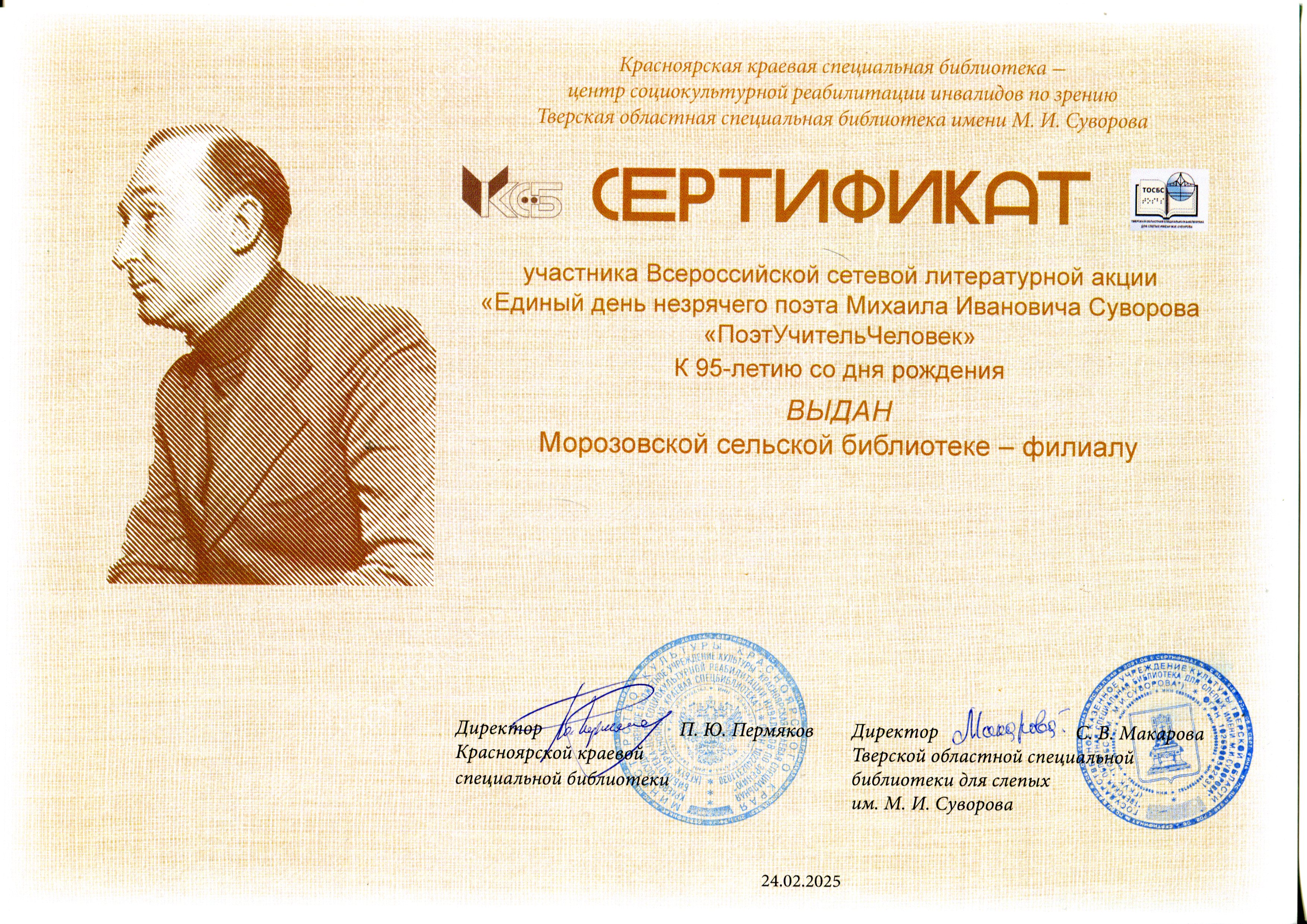 Участники получили Сертификаты от организаторов акции - Красноярской краевой специальной библиотеки и Тверской областной специальной библиотеки для слепых им. М.И. Суворова.