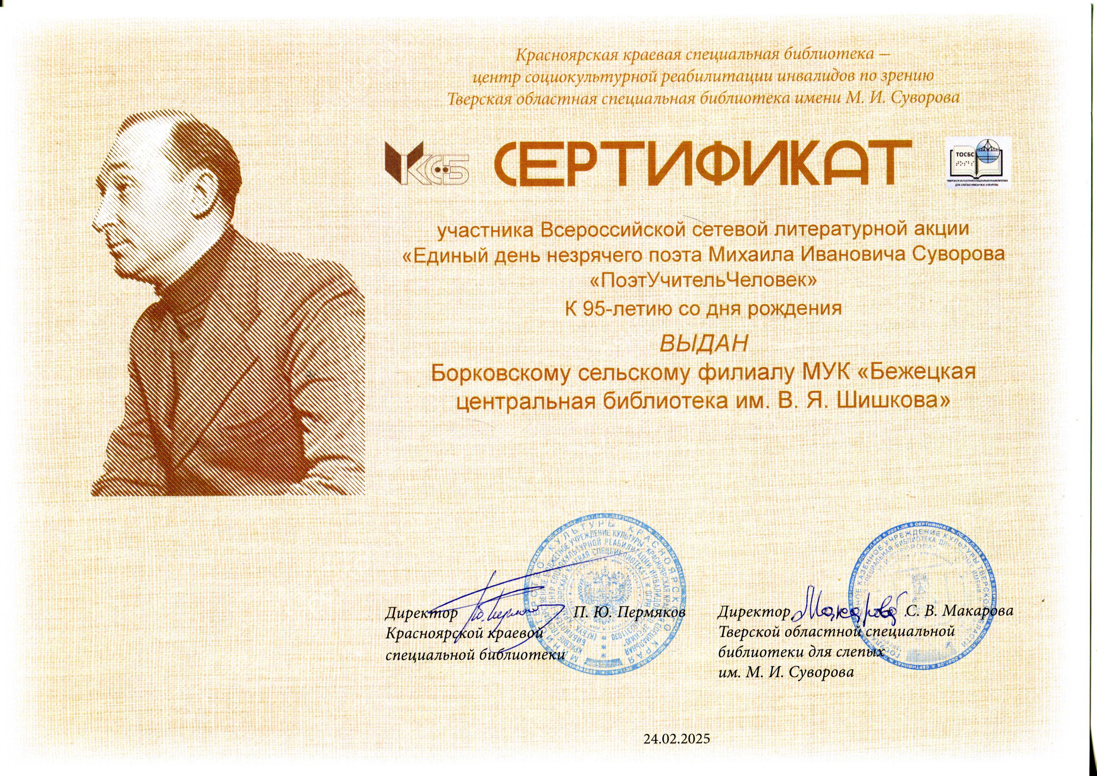 Центральная библиотека им. В.Я. Шишкова, Борковская, Морозовская и Присецкая сельские библиотеки приняли участие во Всероссийской сетевой литературной акции "Единый день незрячего поэта Михаила Ивановича Суворова "ПоэтУчительЧеловек", посвященной 95-летию со дня рождения поэта.
