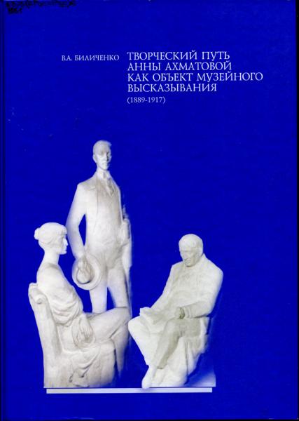 Биличенко В. А. Творческий путь Анны Ахматовой как объект музейного высказывания, (1889-1917) : научно-просветительское издание / Валентина Андреевна Биличенко. - Санкт-Петербург : [б. и.], 2008. - 399, [1] с., [8] л. цв. вкл. Автор книги Валентина Андреевна Биличенко – создатель музея «Анна Ахматова. Серебряный век». В.А.Биличенко является автором 3-х монографий, 7-и книг, многочисленных публикаций в журналах и газетах. Среди ее работ есть монография «Бедуинский образ жизни. Адреса Ахматовой». Место хранения: |