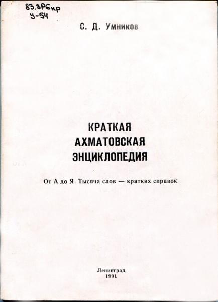 Умников С. Д. Краткая ахматовская энциклопедия : от А до Я. Тысяча слов - кратких справок / С.Д. Умников. - Ленинград : Б. и., 1991. - 112 с. Место хранения: |