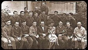 Сидят в первом ряду слева направо: Павел Попович, Виктор Горбатко, Евгений Хрунов, Юрий Гагарин, С.П. Королев, его жена Нина Королева с дочкой Поповича Наташей, Евгений Карпов(начальник ЦПК), Николай Никитин (тренер по парашютной подготовке), Евгений Федоров (врач). |