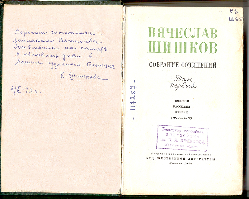 На первом томе собрания сочинений другой автограф: «Дорогим читателям – землякам Вячеслава Яковлевича на память о юбилейных днях в вашем чудесном Бежецке. К. Шишкова 6/Х – 73г.»