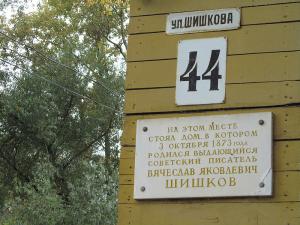 На фасаде мемориальная доска: "На этом месте стоял дом, в котором 3 октября 1873 г. родился выдающийся советский писатель Вячеслав Яковлевич Шишков".