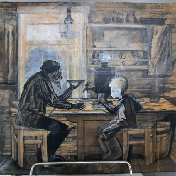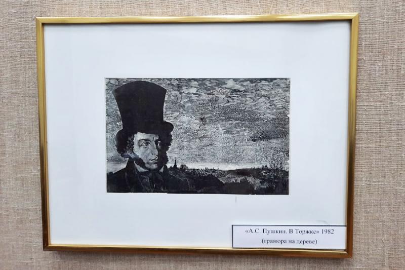На нашей выставке, которая предоставлена нам вдовой художника – Светланой Николаевной Клюшиной, представлены картины из серий "А.С. Пушкин", "Анна Ахматова", "Детство", "Сны золотые" и Экслибрисы ( это книжный знак, удостоверяющий владельца книги) знаменитых людей Тверской земли.