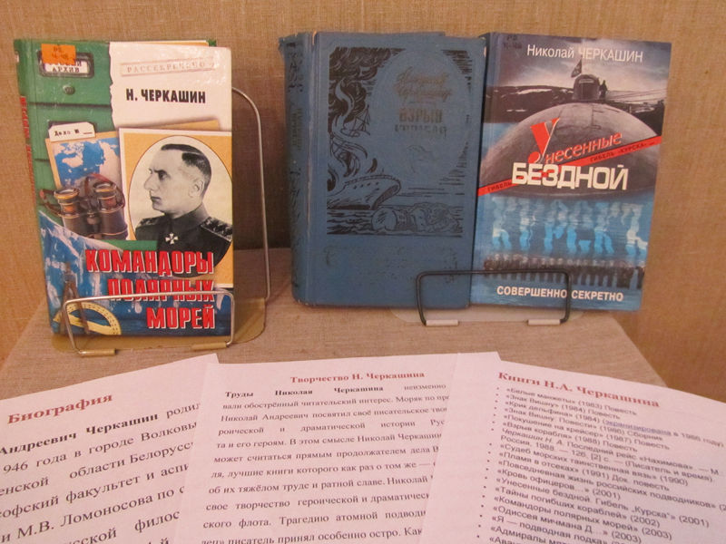 Моряк по профессии, Николай Андреевич посвятил своё писательское творчество героической и драматической истории Русского фло-та и его героям. В этом смысле Николай Черкашин, пожалуй, может считаться прямым продолжателем дела Валентина Пикуля, лучшие книги которого как раз о том же — о море, о моряках, об их тяжёлом труде и ратной славе. Николай Черкашин посвятил свое творчество героической и драматической истории Российского флота. Трагедию атомной подводной лодки «Комсомо-лец» писатель принял особенно остро. Как бывший подводник, он хорошо понимал, что пришлось пережить членам экипажа. Повесть «Пламя в отсеках», рассказывающая о катастрофе близ острова Медвежий, о героической борьбе экипажа за живучесть подводного корабля, о бедах и проблемах спасательной службы, — долг памяти писателя перед моряками-подводниками. Большой читательский интерес вызвала книга «Адми-рал Колчак», посвященная этому разносторонне одаренно-му человеку, горячему патриоту России. Нестандартная форма подачи материала, уникальные факты и документы, найденные автором, — еще одно свидетельство таланта замечательного писателя и историка. Его труд удостоен Всероссийской литературной премии им. Александра Невского.