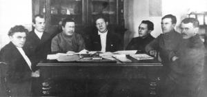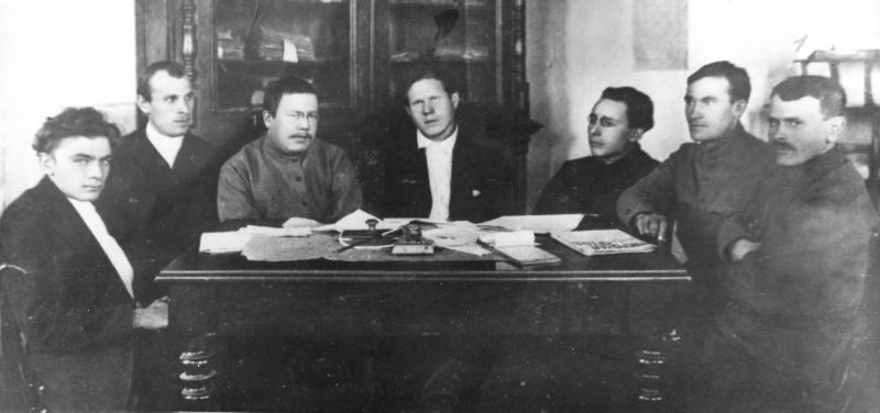 3-ий ряд стоят: Марков - зав. адм. отделом, Лазарев - политкомиссар, Логинов Д.И. - пред. ЧК