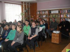 настоятель храма Тихвинской иконы Божией матери о.Алексий. Он рассказал об одном из важнейших церковных событий празднике Сретение Господне, который отмечается 15 февраля. В этот день по исполнении сорока дней после рождения Богомладенец Иисус был принесен по закону в храм для посвящения Богу. Это была встреча (на церковно-славянском языке «Сретение») человечества с Богом. С большим вниманием подростки слушали о. Алексия. Он призывал подростков вести здоровый образ жизни, развивать в себе духовные и нравственные качества, посещать храм, потому что вера формирует личность, если она есть, то есть и нравственные ценности, которые определяют отношение человека ко всему происходящему вокруг.