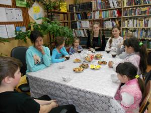 С удовольствием посмотрели отрывки из мультфильма «Фантастические летающие книги мистера Мориса Лессмора», послушали песню «Крылатые качели» в исполнении Зубцовой Жени. Незаметно для всех настало время чаепития. Встреча продолжалась почти три часа, понравилось всем без исключения. Дети просили проводить свои собственные библиосумерки и библионочи чаще. Присутствовало 11 детей и 4 взрослых (родители).