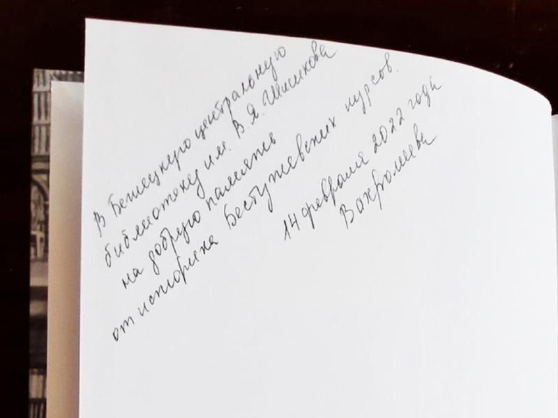 От неё библиотека получила в дар монографическое исслеование "Преподавание наук на Высших женских (Бестужевских) курсах (1878 - 1918) с дарственной надписью.