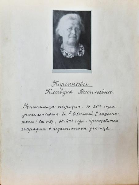 - "Заслуженный учитель школы РСФСР. Учительница русского языка и литературы, она проработала в школах и много лет в педучилище - до 1960 года.