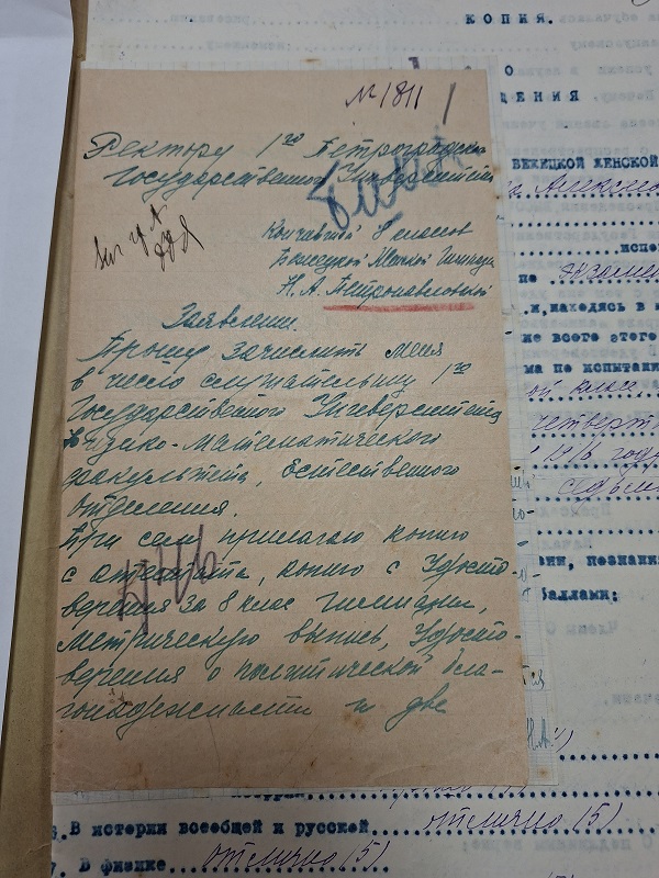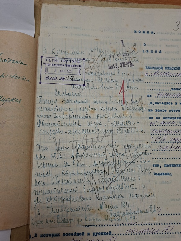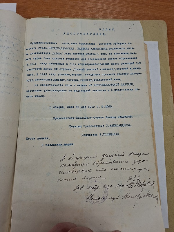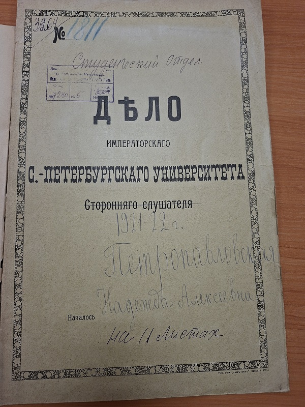 Из сканированного личного дела студентки Императорского Санкт-Петербургского университета мы узнали, кто были родители Надежды Алексеевны, адрес её жительства в Бежецке (ул.Карла Маркса, д.40), год рождения в деле указан 1900, но этого никак не может быть, так как Н.А. Петропавловская окончила бестужевские курсы в 1914 году (о чём сама пишет в автобиографии) - возраст не подходящий для слушательницы курсов. Так же мы узнали и многие другие факты, касающиеся её профессиональной деятельности.