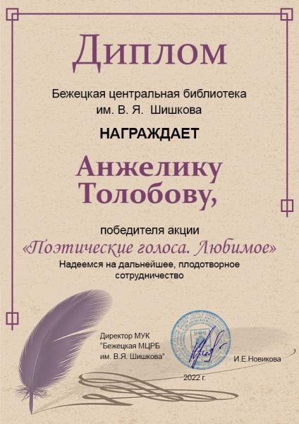 По итогам интернет-голосования победителем акции "Поэтические голоса. Любимое" стала Анжелика Толобова, ученица 11 класса МОУ "Гимназия №1 им. В.Я.Шишкова".