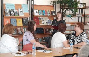 Гл. библиотекарь читального зала Арина Карпова познакомила гостей с книгами, представленными на выставке "Был он рыцарем Света и Слова...", посвященной Николаю Гумилёву.