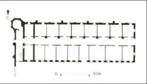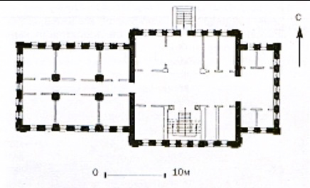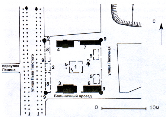 1 - Место расположения Благовещенского собора, 2 - Место расположения надвратной колокольни, 3 - Настоятельский корпус, 4 - Северный келейный корпус, 5 - Место восточных келейных корпусов, 6 - Юго-восточный келейный корпус, 7 - Северо-восточный келейный корпус, 8 - Место западных келейных корпусов, 9 - ограда с башнями.
