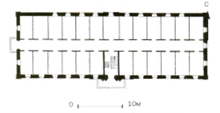 С е в е р о - в о с т о ч н ы й к е л е й н ы й к о р п у с сохранился хуже других. Протяженная двухэтажная постройка (низ кирпичный, верх деревянный с оштукатуренными фасадами), завершённая вальмовой кровлей, сохранила первоначальные габариты, но полностью утратила фасадный декор. Планировка коридорная.