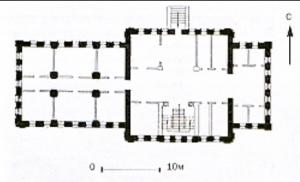 Кирпичный оштукатуренный н а с т о я т е л ь с к и й к о р п у с - вытянутый крестообразный в плане двухэтажный с высоким полуподвалом объем, завершенный вальмовой кровлей. Центральная часть, одновременно являющаяся четвериком домовой церкви, сейчас имеет четырехскатную кровлю с фронтоном на северной и южной сторонах. Поэтажное членение фасадов карнизами и подоконными тягами, проходящими по периметру здания, подчеркивает их протяженность, фланги оформлены лопатками, окна с лучковыми перемычками - рамочными наличниками. Ризалиты продольных фасадов выделяются арочными окнами в обрамлении двойных наличников с прямыми сандриками и аркатурным поясом, дополняющим венчающий карниз. Планировка коридорного типа. Полуподвал перекрыт системой коробовых, лотковых и парусных сводов на крещатых столбах.