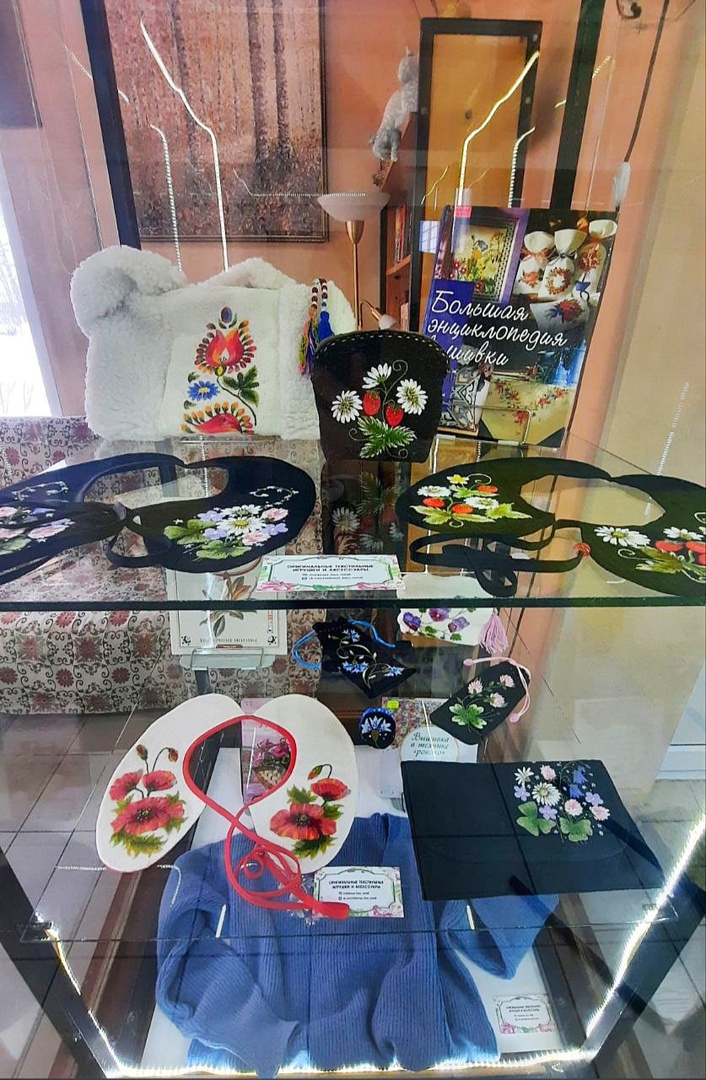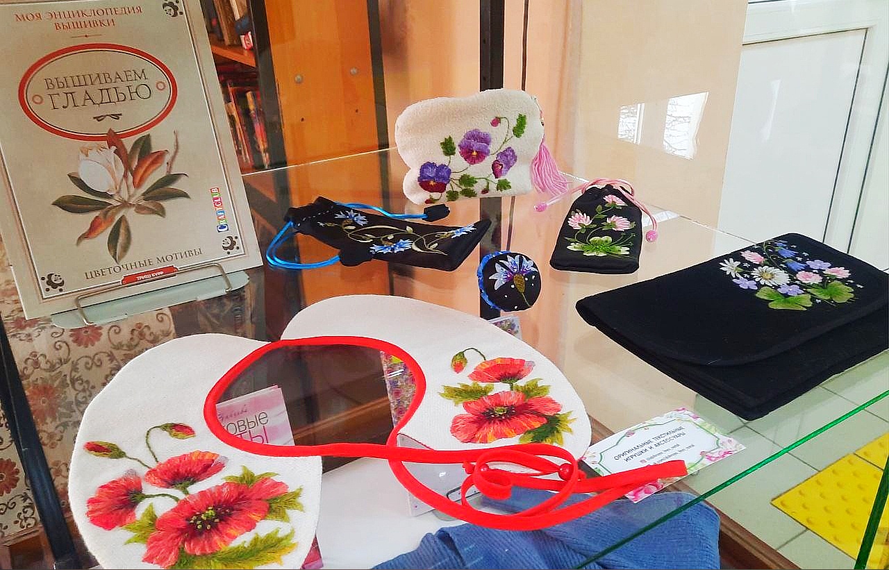 В фойе библиотеки в двух ярко освещённых витринах разместилась феерия красок и утончённого изящества - выставка вышитых работ нашей землячки, сейчас проживающей в Твери.