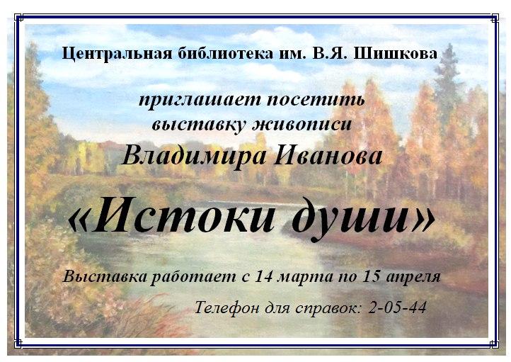 С 14 марта по 15 апреля в центральной библиотеке им. В.Я. Шишкова работает выставка живописи Владимира Иванова |