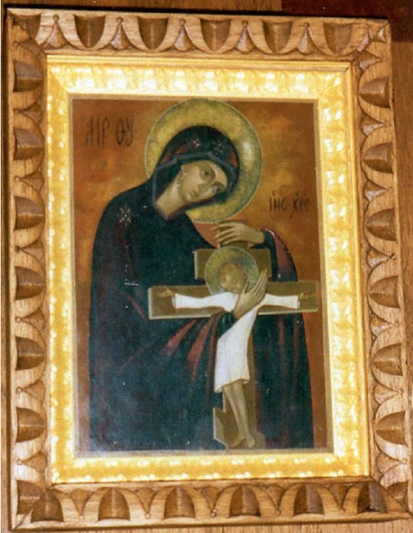 Вышивка не сохранилась, но подруга Елизаветы Юрьевны по лагерю Е. А. Новикова, которой удалось выжить в Равенсбрюке, описала икону. И художница С.А.Раевская - Оцуп под руководством сестры Иоанны Рейтлингер, хорошо знавшую стиль икон матери Марии, написала ее по мотивам вышивки.