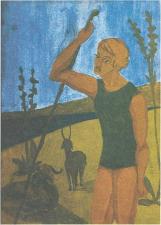 В акварелях Е.Ю.Кузьминой – Караваевой сложно узнать в молодом человеке Пастыря: ни нимба, ни креста на посохе нет. Лишь сам пастушеский посох в руках юноши да овцы, жмущиеся к нему, позволяют угадать библейский сюжет. Приближенный к зрителю первый план и условность пейзажа на втором плане, яркие цветовые пятна, однородная затушовка лица и тела коричневым тоном демонстрируют тяготение художницы к искусству авангарда.