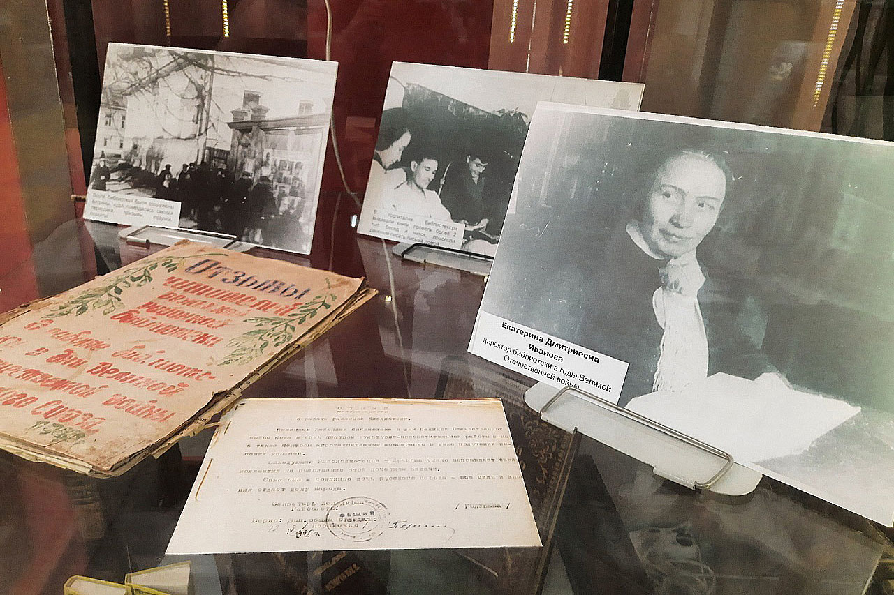 На ней представлены копии документов, фотографии, отражающие значимые вехи в истории библиотеки: открытие библиотеки, работа в годы Великой Отечественной войны и присвоение библиотеке в 1956 году имени писателя-земляка Вячеслава Яковлевича Шишкова, редкие книги и книги с автографами.