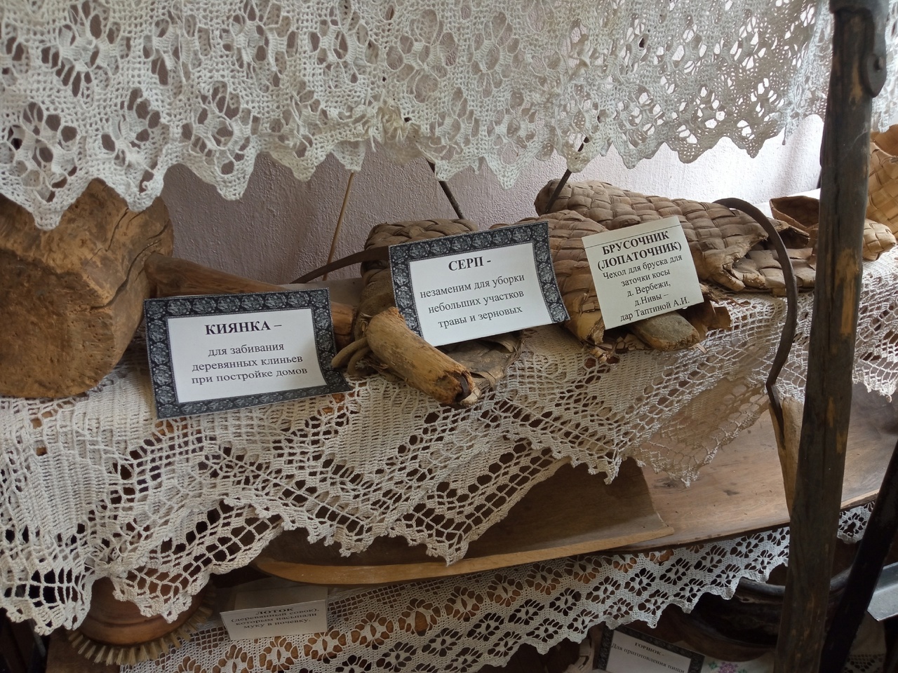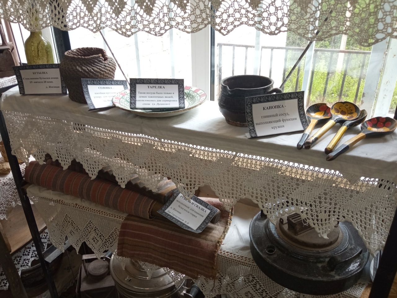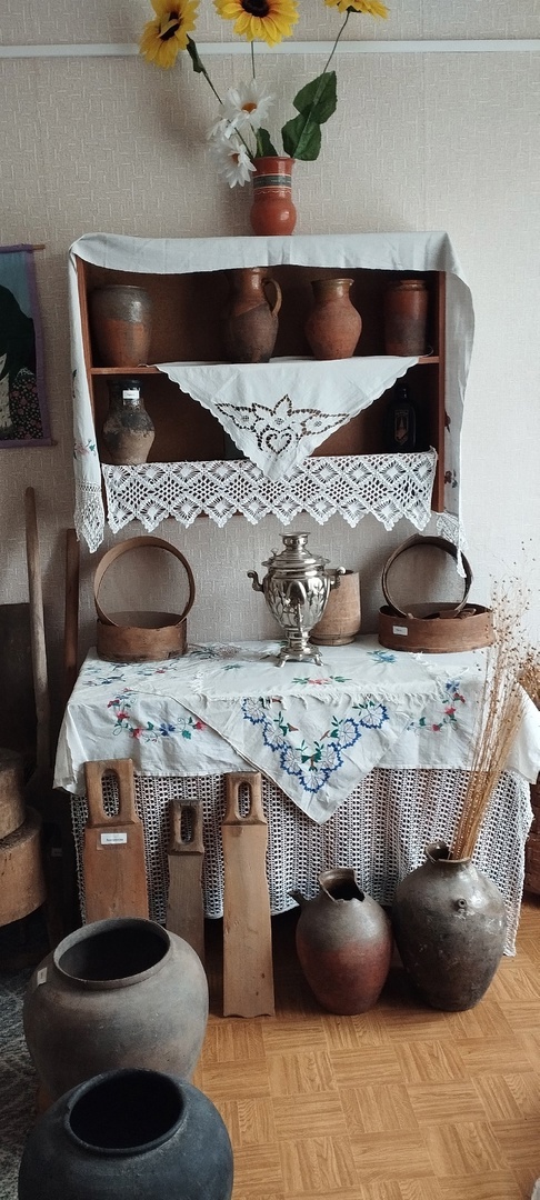 Здесь представлены предметы крестьянского быта из дерева, глины, металла, льна, фарфора, стекла и даже кружев.