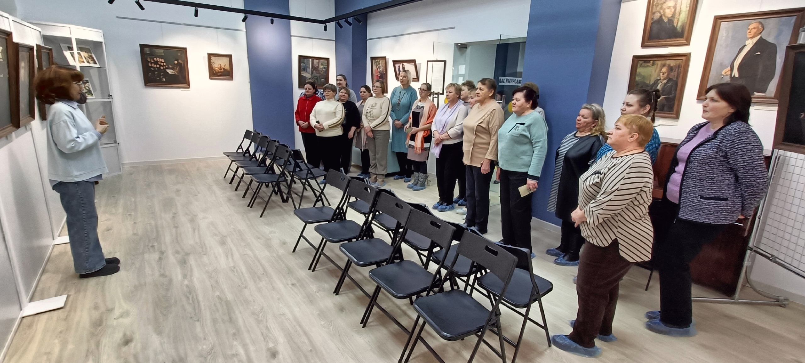 Свою работу наши коллеги начали с посещения выставки "Слияние искусств. Музыка в живописи". Главный библиотекарь по краеведению Ольга Рожкова познакомила гостей с картинами, экспонирующимися в выставочном зале и рассказала о предстоящих выставках.