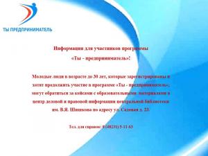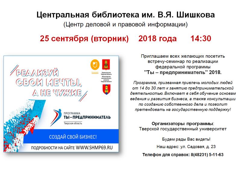 Приглашаем Вас принять участие в Программе «Ты - предприниматель», реализуемой в Тверской области в 2018 году при поддержке Министерства экономического развития Тверской области.