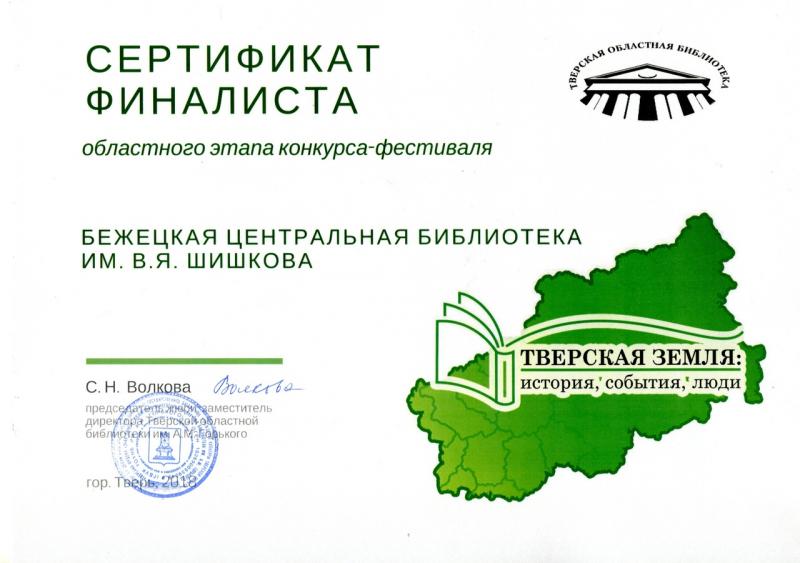 18 февраля в Тверской областной библиотеке им. А.М. Горького состоялась презентация событий 2018 года конкурса-фестиваля библиотек "Тверская земля: история, события, люди". Бежецкая центральная библиотека им. В.Я. Шишкова заняла 2-е место в номинации «Популяризация творчества местных авторов». Было представлено мероприятие «Певец народной жизни» (торжественный вечер, посвященный 145-летию со дня рождения В. Я. Шишкова). |