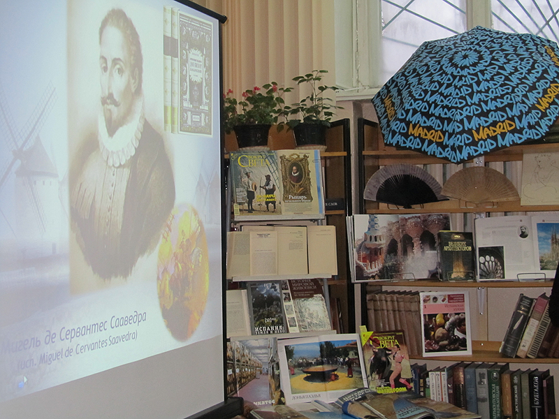 2011 год был годом Испании в России и России в Испании. Культуре и традициям этой страны была посвящена книжно-иллюстративная выставка «Путешествие в страну вечерней звезды». Внимание к выставке привлекало яркое пятно настоящего испанского зонтика, испещренного словом «Милан». Электронная презентация заставила всех зрителей забыть о декабрьском Бежецке и, затаив дыхание, слушать увлекательные истории о сказочной стране Испании, ее культурных богатствах, наслаждаться архитектурными достопримечательностями и зажигательными и грациозными танцами фламенко. Не оставил никого равнодушным и рассказ об известных испанских футбольных клубах. В заключение вечера еще один подарок – чай с традиционными угощениями, приготовленными Светланой Александровной по настоящим испанским рецептам: чурросом, манолетосом, польворонесом, карамелизированными апельсинами по-каталонски.