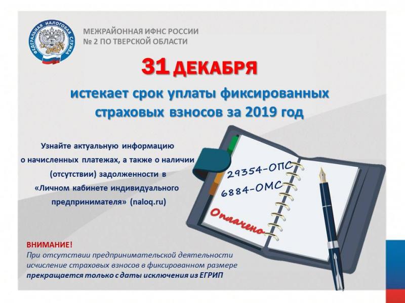 Межрайонная ИФНС России № 2 по Тверской области напоминает, что 31 декабря 2019 года истекает срок уплаты страховых взносов в фиксированном размере: 29354 рубля - взносы на обязательное пенсионное страхование (ОПС), 6884 рубля - взносы на обязательное медицинское страхование (ОМС).