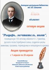 20 апреля завершилась сетевая акция "Рыцарь, мечтатель, поэт", посвященная 135-летнему юбилею Николая Степановича Гумилёва. В акции приняли участие более 70 читателей, коллег - библиотекарей и поклонников его творчества.
